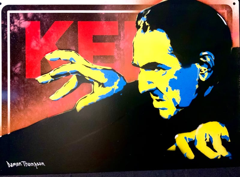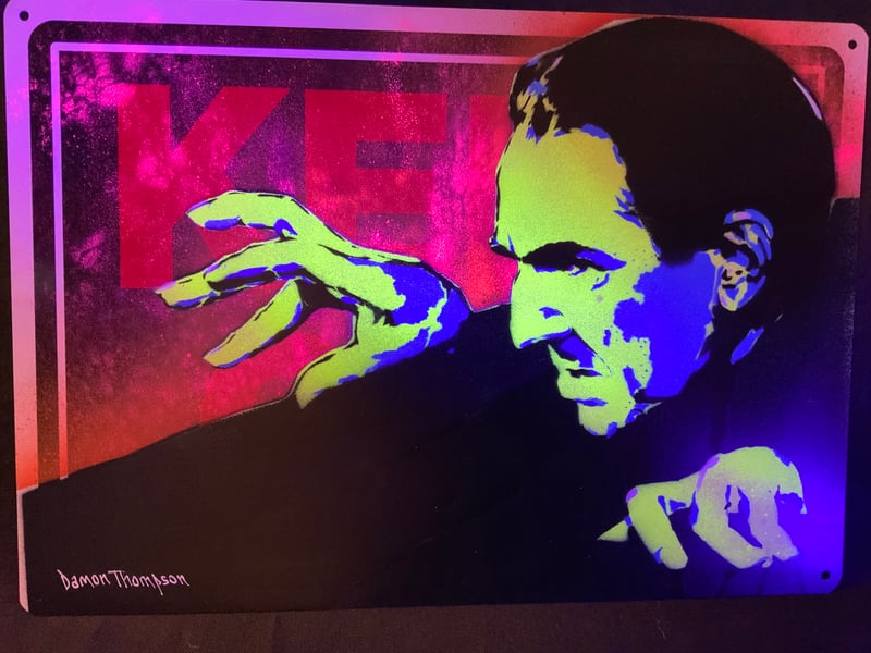 Bela Lugosi didn’t just play Dracula, he became the blueprint for every vampire that followed, blending elegance with menace in a way no one else has matched. Multi-layered, hand cut, spray paint stencil on 10” x 14” “KEEP OUT” tin sign.