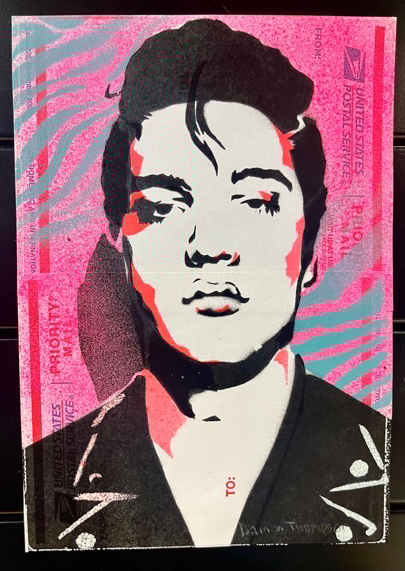 Multi-layered color stencil on doubled priority mail label. Signed 8” by 5 1/2”