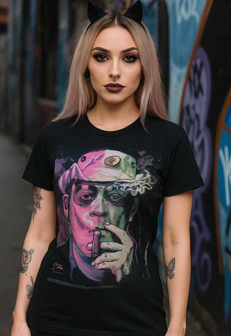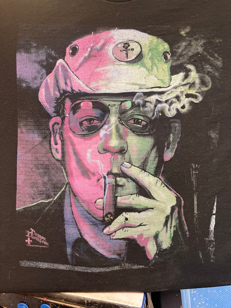 The powerful image of legendary gonzo journalist Hunter S. Thompson, created from the mural I did, and put onto a 100 percent cotton short sleeve shirt. Tultex 202 unisex shirt